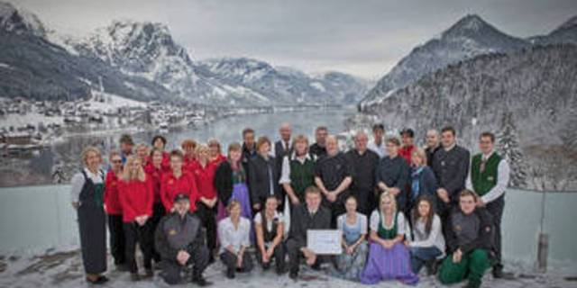 Das MONDI-HOLIDAY Hotel Grundlsee »versüßt« sowohl seinen Mitarbeitern als auch Tagungsgästen die Arbeit: Für sehr gute Arbeitsbedingungen und eine bemerkenswerte Unternehmenskultur gab’s die Auszeichnung »Best-for-People«. Hervorragende Dienstleistungen und Angebote für die anspruchsvolle Klientel der Tagungsgäste führten zur Bewertung des Hauses als einem der Top-Seminarhotels der Steiermark. Im Bild: Hoteldirektor Franz Kromoser und sein Team mit einer der Auszeichnungen auf der Terrasse des MONDI-HOLIDAY Hotel Grundlsee.