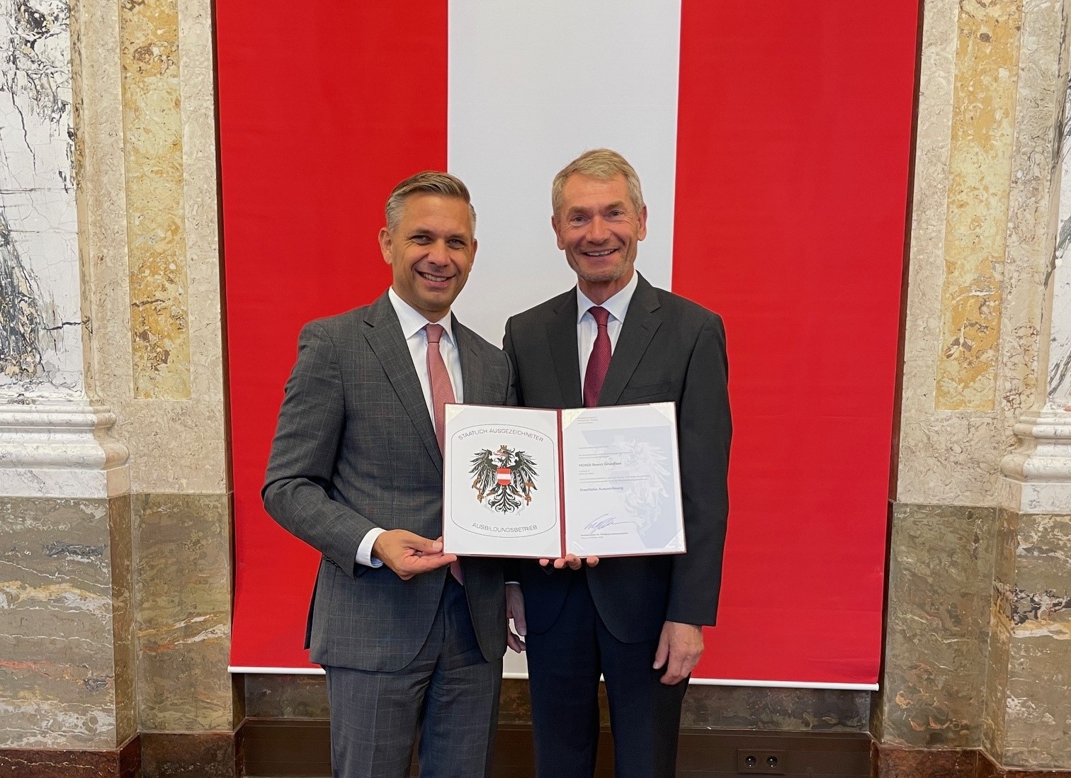 (Grundlsee) Das MONDI Resort am Grundlsee wurde am 06.10.2025 im Marmorsaal des Regierungsgebäudes in Wien von Bundesminister Dr. Wolfgang Hattmannsdorfer zum „Staatlich ausgezeichneten Ausbildungsbetrieb“ ernannt. Die Auszeichnung gilt als Siegel für landesweit geprüfte Qualität und berechtigt, das Bundeswappen mit Hinweis auf die staatliche Ehrung in Kommunikationsdokumenten zu nutzen.